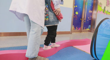 训练方法:先辅助孩子抬起一只脚站立2-3秒,慢慢过渡到双手扶着孩子手腕站立,再到单手辅助,后过渡到独立完成单脚站立。等技能稳定后,可加长时间进行训练。